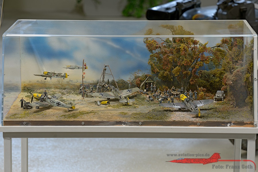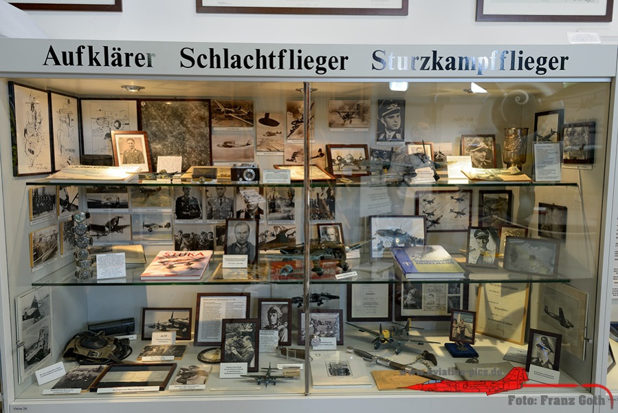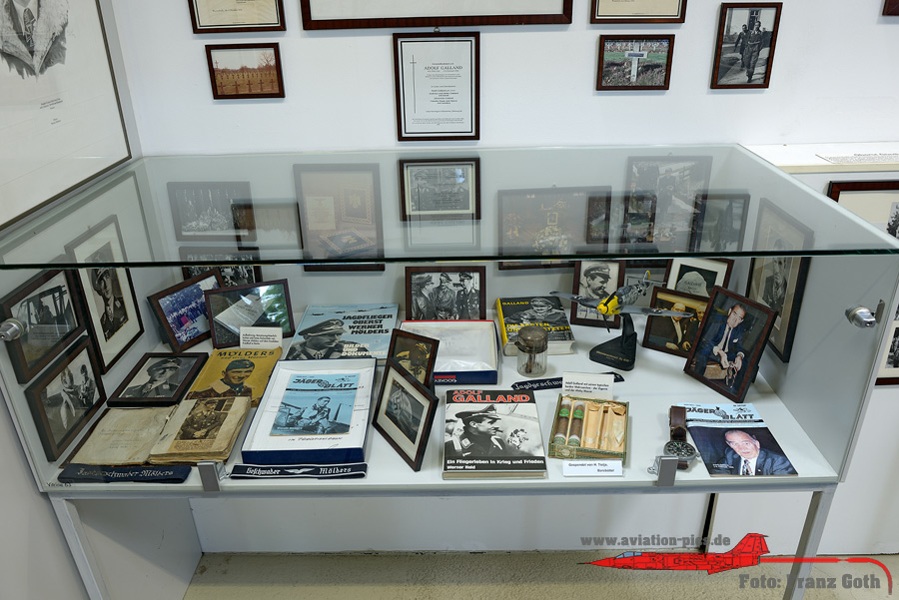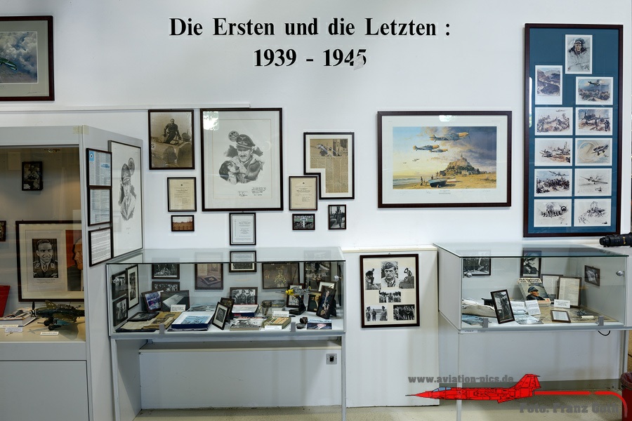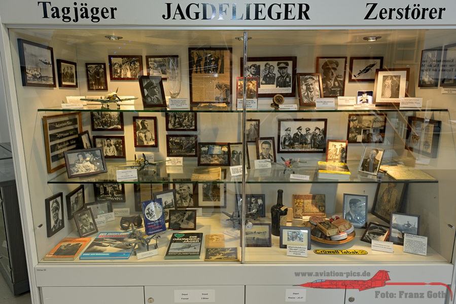 Vitrine Tagjäger – Jagdflieger – Zerstörer mit Fotos und Utensilien von u.a. Galland, Mölders, Wick, Oesau, Wurmheller, Graf, Nowotny, Barkhorn, Eickelmann, Bär, Maltzahn, Müncheberg und Priller, Vitrine Aufklärer – Schlachtflieger – Sturzkampfflieger, Die ersten und die Letzten: 1939 – 1945. Über den Jagdflieger Adolf Galland, Vitrine mit u.a. Gallands Markenzeichen, die Zigarren, Diorama in 1:48: Messerschmitt Bf-109E am Kanal, Instrumentenbrett Messerschmitt Bf 110C, Die Verbände der Luftwaffe mit ein paar Modellen unter einer Fiat G.91 Kabinenhaube, Rekonstruktion von Eduard (Edu) Neumanns Gefechtsstand (Kommodore JG 27 in Afrika). Er bestand aus einem ehemaligen Zirkuswagen und wurde Neumanns Bunte Bühne genannt.