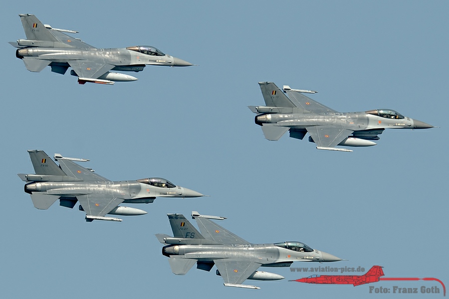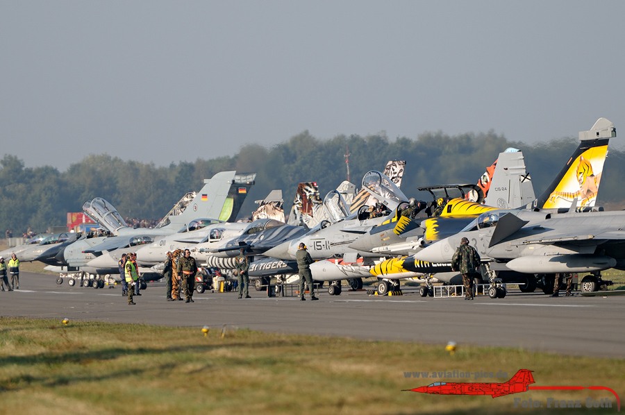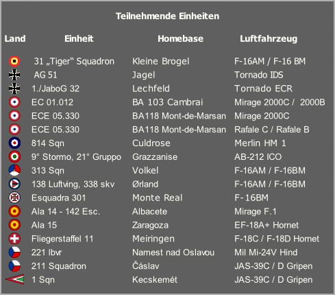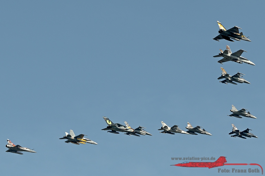 Dassault Mirage 2000C, 118 / 103-YG, EC01.012, French Air Force (Armée de l'Air), Dassault Mirage 2000C, 91 / 103-YR, EC01.012, French Air Force (Armée de l'Air), Dassault Mirage 2000B, 526 / 115-YP, EC.02.005, French Air Force (Armée de l'Air), Dassault Mirage 2000C, 120 / 103-KC, EC01.012, French Air Force (Armée de l'Air), Dassault Rafale B, 304 / 118-EB, ECE 05-330, French Air Force (Armée de l'Air), Dassault Rafale B, 303 / 118-EA, ECE 05-330, French Air Force (Armée de l'Air), F-16A Block 20 MLU, J-062, 313 Sqn, Royal Netherlands Air Force (KLu), F-16AM , FA-87, 31 Squadron, Belgian Air Force, F-16AM , FA-87, 31 Squadron, Belgian Air Force, F-16AM , FA-87, 31 Squadron, Belgian Air Force, Dassault Mirage F.1M, C.14-72 / 14-44, Ala 14, 142 Squadron, Spanish Air Force, Dassault Mirage F.1M, C.14-41 / 14-22, Ala 14, 142 Squadron, Spanish Air Force, MDD EF-18A+ Hornet, C.15-64 / 15-01, Ala 15, Spanish Air Force, F-16AM, 658, 338 Skvadron, Royal Norwegian Air Force, F-16AM, 668, 338 Skvadron, Royal Norwegian Air Force, Saab JAS 39D Gripen, 9820, 211 Squadron, Czech Air Force, Saab JAS 39C Gripen, 9237, 211 Squadron, Czech Air Force, Saab JAS 39D Gripen, 43, 1 Squadron, Hungarian Air Force, MDD F-18C Hornet, J-5011 / 011, Fliegerstaffel 11, Swiss Air Force, MDD F-18C Hornet, J-5012 / 012, Fliegerstaffel 11, Swiss Air Force, MDD F-18D Hornet, J-5232 / 232, Fliegerstaffel 11, Swiss Air Force, Panavia Tornado IDS 45+06 „Eye of the Tiger“, AG51, German Air Force, Panavia Tornado IDS 45+22, AG51, German Air Force, Tigerformation über Kleine Brogel, F-16A Block 20 MLU, FA-134, 349 Sqn, F-16 Solo Display Team, Belgian Air Force, Pilot: Cdt. Michel „Mitch“ Beulen, Dassault-Dornier Alpha Jet-E, E38 / 314-LH, EAC 00.314, French Air Force, F-16A Block 20 MLU, J-015, 311 Sqn, F-16 Demo Team, Royal Netherlands Air Force (KLu), Pilot Capt. Ralph “Sheik” Aarts, F-16A Block 20 MLU, J-015, 311 Sqn, F-16 Demo Team, Royal Netherlands Air Force (KLu), Pilot Capt. Ralph “Sheik” Aarts, F-16AM 4-Ship Formation, Belgian Air Force, Mil Mi-24V Hind, 7360, 221 Letka Bitevních Vrtulníkù, Czech Air Force, Mil Mi-24V Hind, 7354, 221 Letka Bitevních Vrtulníkù, Czech Air Force, Agusta AB-212AM, MM81148, 21 Squadron, Italian Air Force , EH Industries Agusta Westland EH-101 Merlin HM1, ZH838, Royal Navy, Lockheed C-130H Hercules, CH-05, 15 Transport Wing, Belgian Air Force, Piper L-18C Super Cub (PA-18-95), L-33 in den Farben der Belgischen Luftwaffe, SIAI Marchetti SF260D, ST-48, 5 Smaldeel, Belgian Air Force