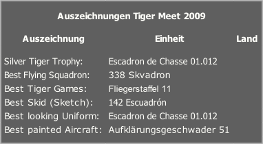 Mit mehr als 850 Piloten und Technikern aus 12 Nationen war es bislang eines der größten Tiger Meets in der fast fünfzigjährigen Geschichte der NATO Tiger Association. Mehr als 60 Kampfflugzeuge sowie rund zehn Helikopter und Propellermaschinen wurden an acht geplanten Flugtagen über 800 Trainingseinsätze absolviert. Damit war das Tiger Meet 2009 eine der größten fliegerischen Übungen in Europa (Quelle: Luftwaffe.de).