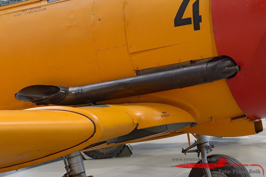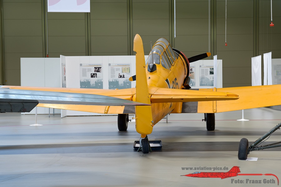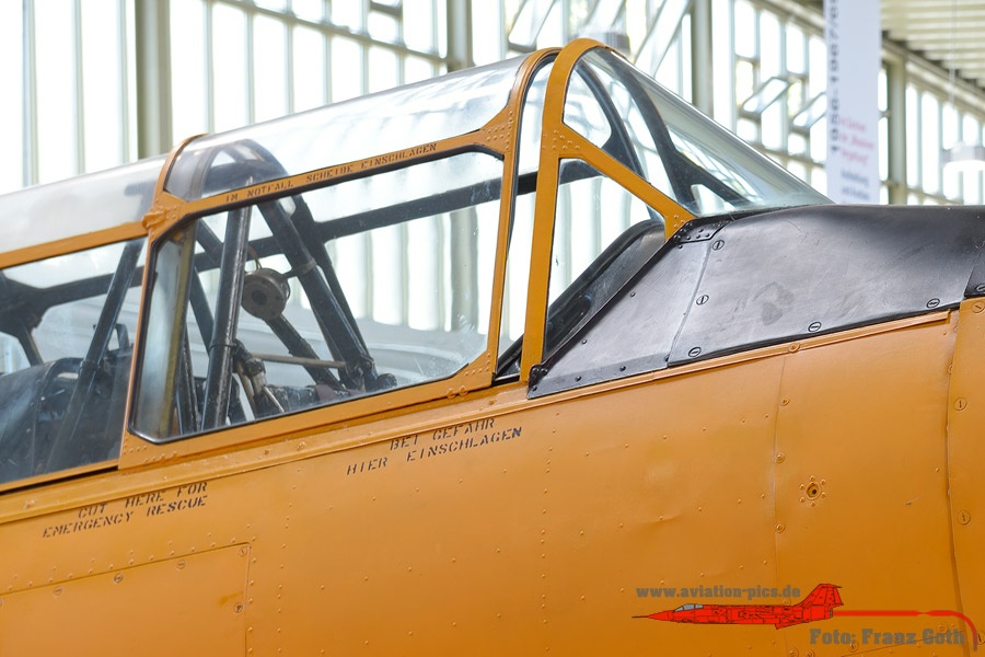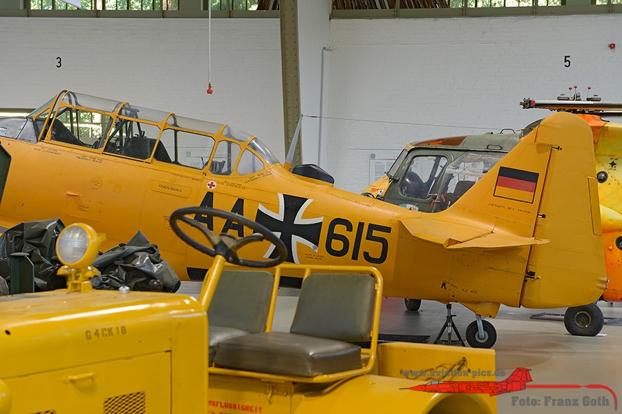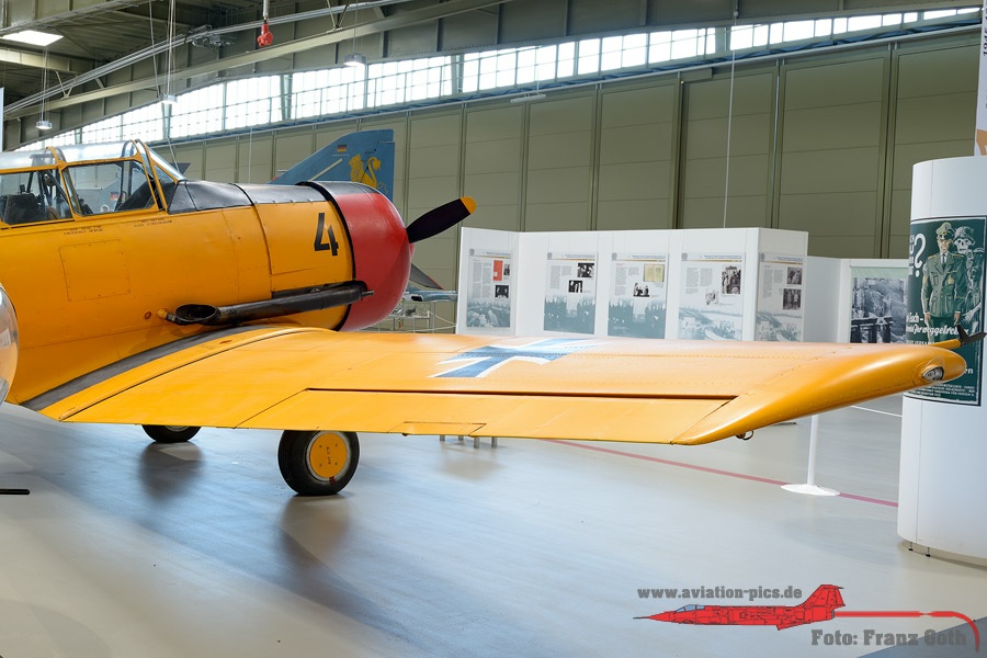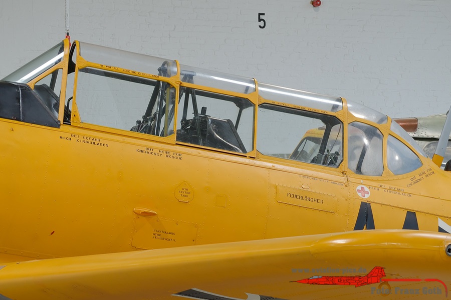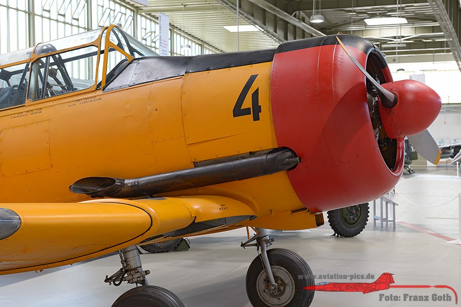 Die hier ausgestellte CCF ( Canada Car and Foundry) Harvard Mk.IV in den Farben der FFS A, stationiert in Landsberg. Zeitweise gehörte dieses Flugzeug zum Kunstflugteam der FFS A. Ein Teil der Harvards gingen auch an die TSLw 1 in Kaufbeuren. Kanada lieferte im Jahre 1956 135 dieser „Zitronenbomber“ zum symbolischen Preis von 1 Dollar pro Stück an die Bundesluftwaffe.
